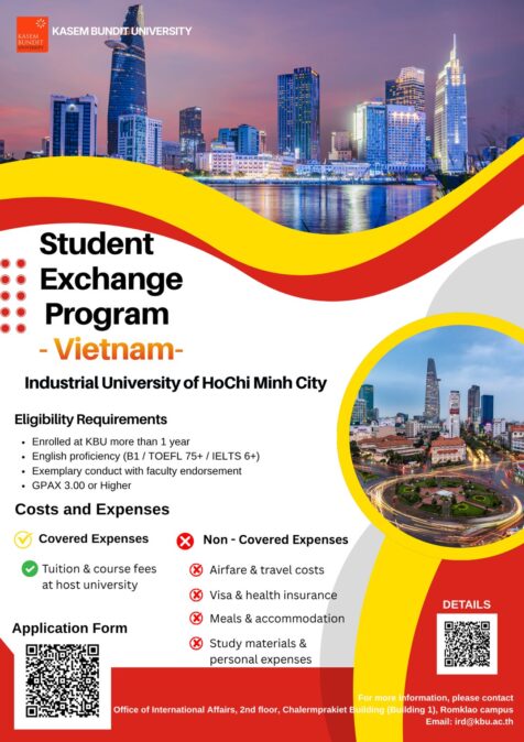 1. Be a current full-time student at Kasem Bundit University for at least 1 academic year before applying for the student exchange program.